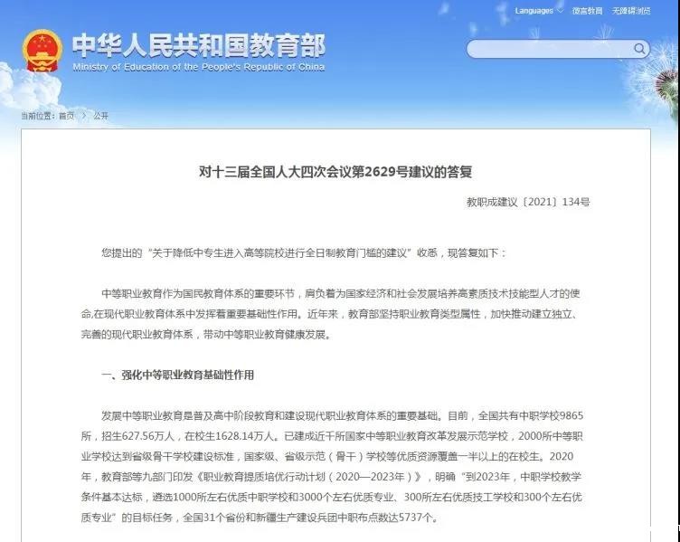 教育部:逐步建立“职教高考”制度,降低中职上大学门槛,可免试入学! 发布日期:2021-11-15